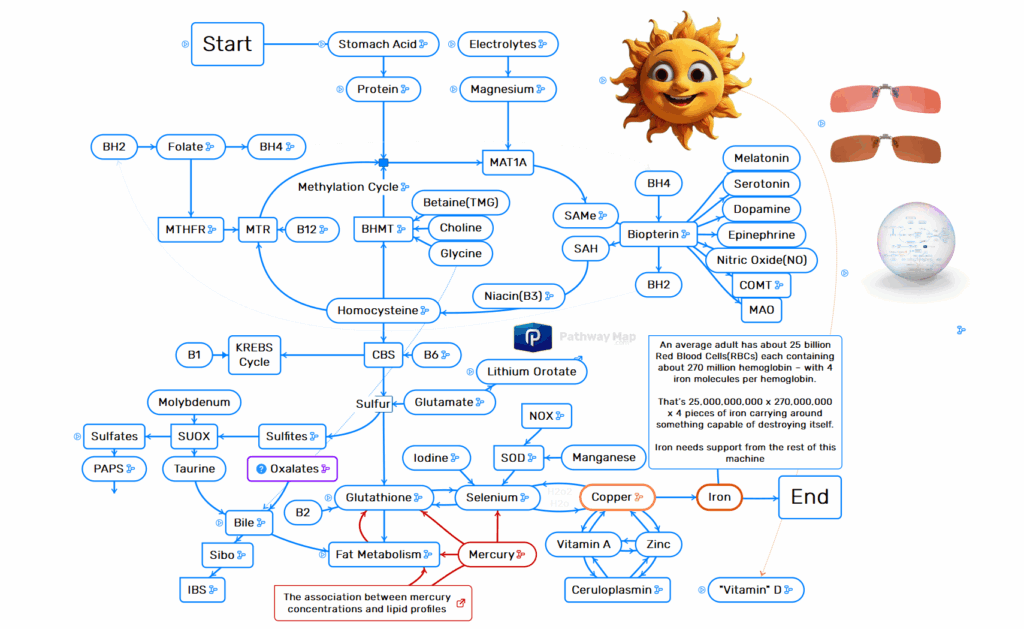 The entire sulfur metabolism pathway gets disrupted. The transsulfuration pathway that makes glutathione, the methylation cycle that makes neurotransmitters and DNA and everything else, both depend on sulfur chemistry. Both get blocked by mercury.