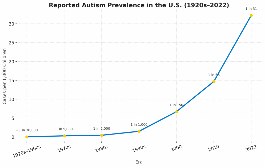 Let’s be clear about something. Autism as we know it today is not an ancient condition that we’re just “recognizing better now.” Yes, there have always been people who struggled socially, who thought differently, who had sensory sensitivities. But one in thirty-six children is not better recognition. That’s a systemic collapse.
