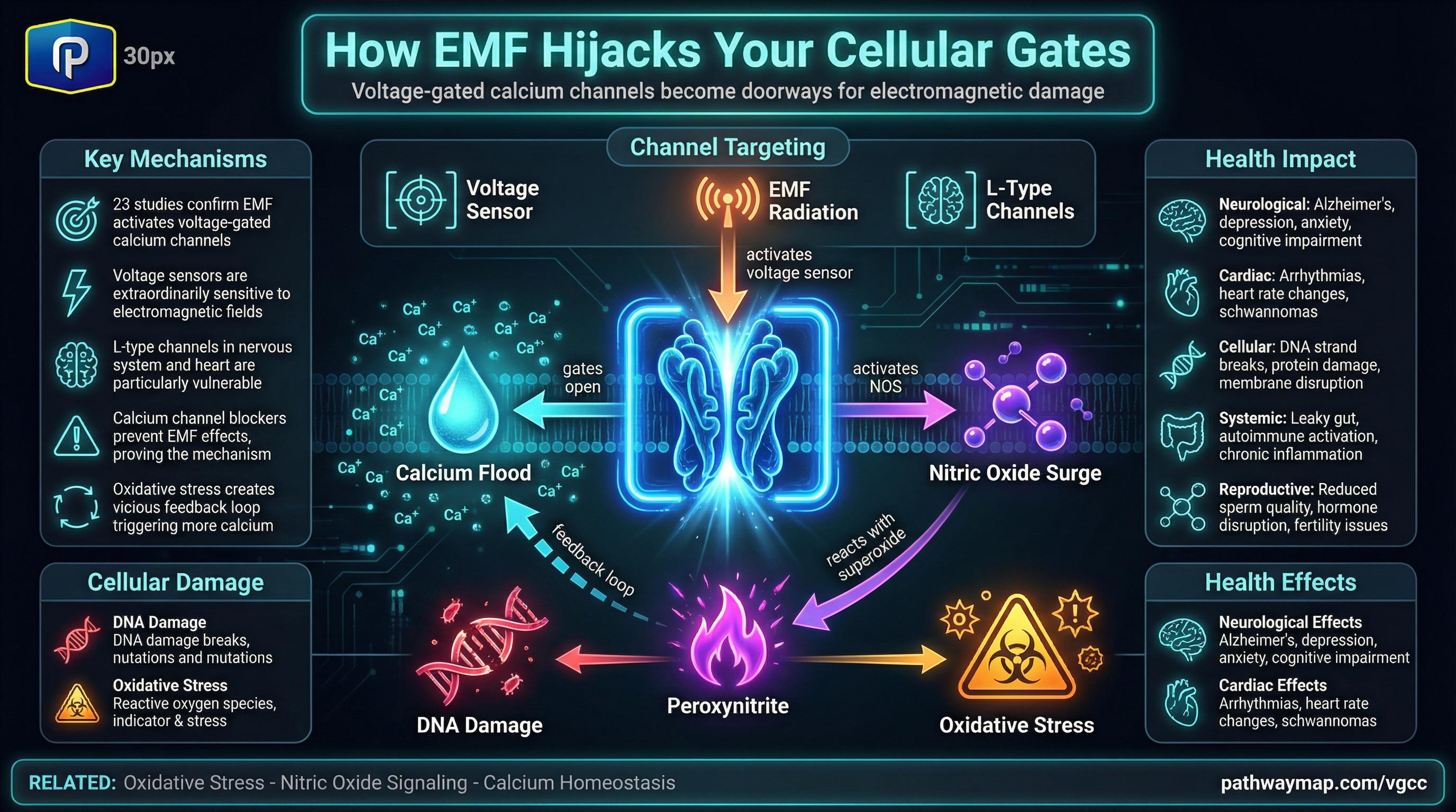 The science of how non-native electromagnetic frequencies affect our biology through voltage-gated calcium channels, antioxidant depletion, and DNA damage. 23 studies document the mechanisms.