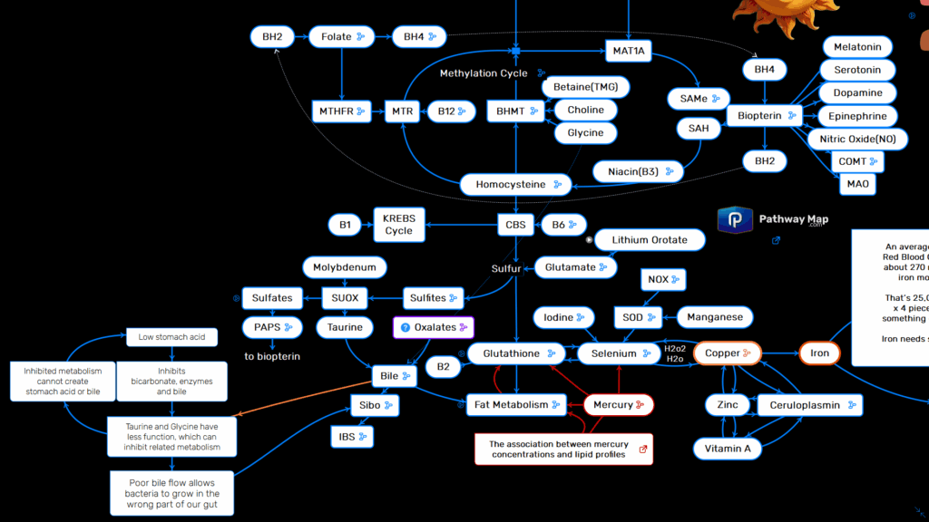 Copper and bile dance as partners requiring perfect balance – bile serves as the primary route for copper elimination (95% exits through bile), while copper-dependent enzymes help produce bile. Excess copper from IUDs, pipes, or poor methylation creates thick, congested bile and gallbladder sludge. Conversely, copper deficiency impairs bile production. Zinc supplementation helps balance copper through metallothionein proteins.